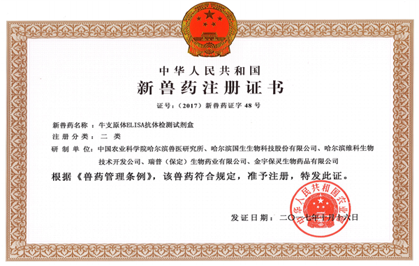 熱烈祝賀哈爾濱國生生物科技股份有限公司“牛支原體ELISA抗體檢測試劑盒”獲得新獸藥注冊證書